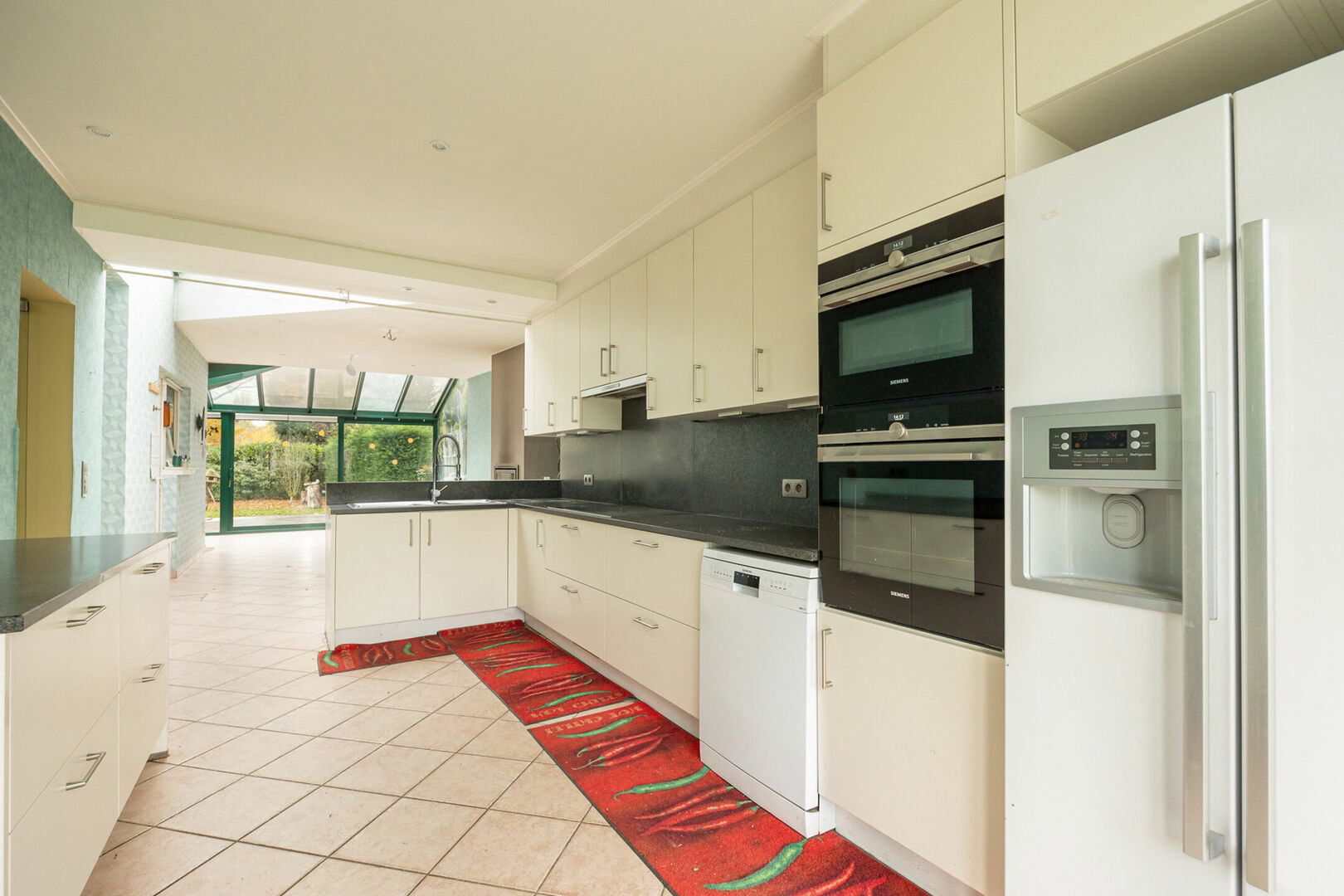 Via de uitnodigende inkomhal met gastentoilet hebben we toegang tot een bureauruimte of extra slaapkamer en een praktische berging. De uitgeruste keuken sluit mooi aan op de eetplaats en de gezellige veranda. Dankzij het grote schuifraam geniet je van een directe verbinding met de prachtige tuin en het zonneterras.