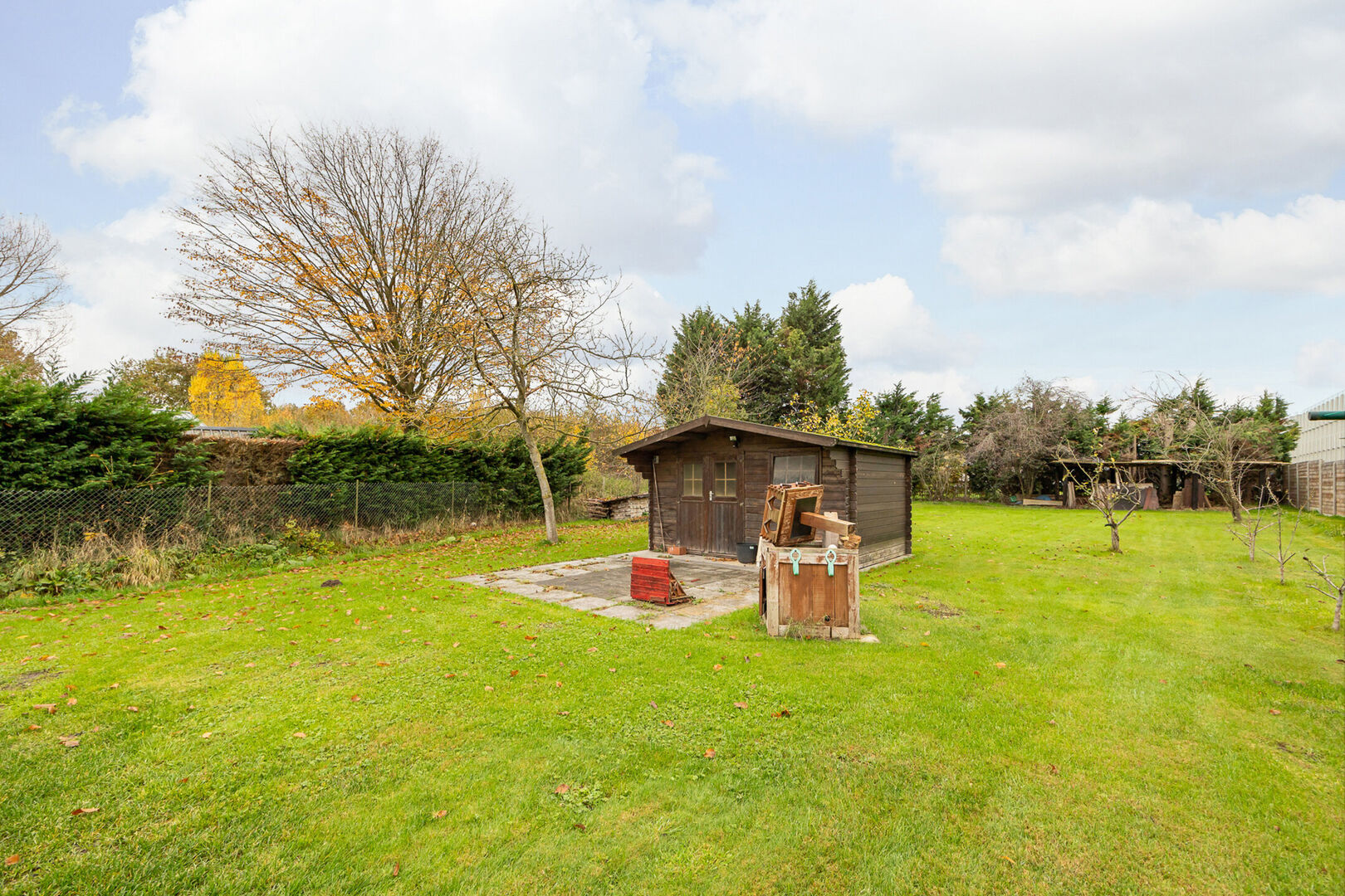 Achter de carports ligt een prachtig stuk weiland met magazijn/stalling – ideaal voor diverse hobby- of beroepsdoeleinden.