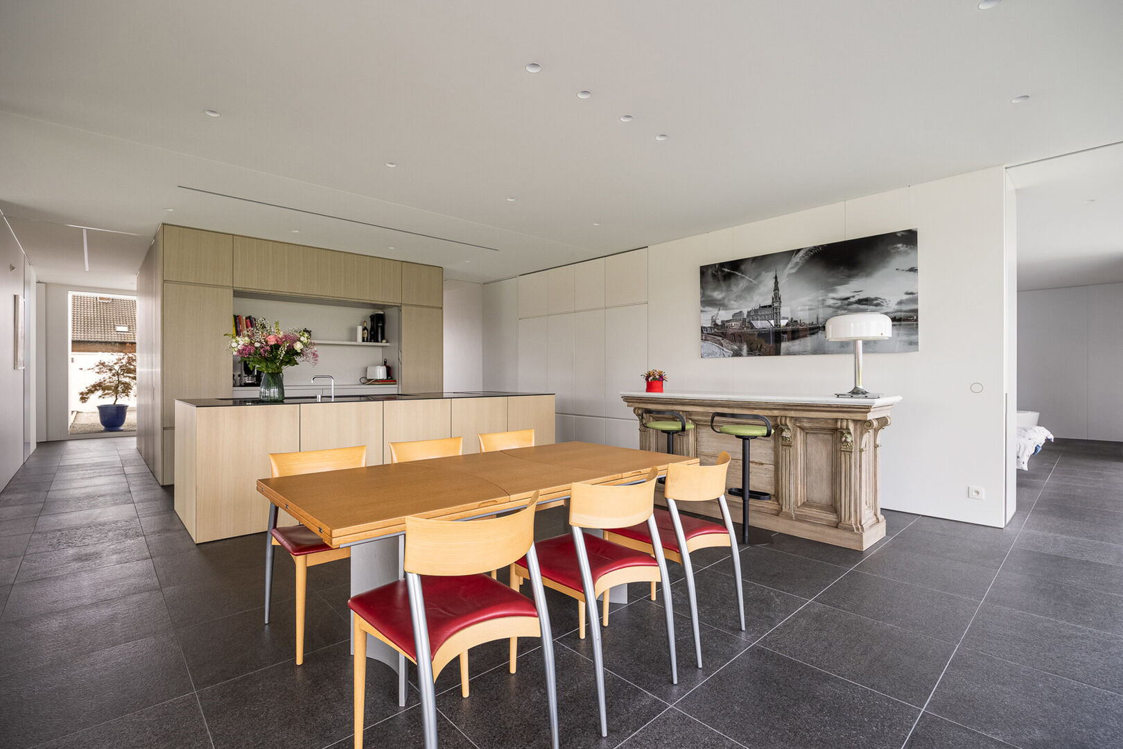 In keuken en zithoek kunnen de gigantische raampartijen worden geopend en kan men genieten van het terras, op hetzelfde vloerniveau als binnen. De vloeren zijn basalt zowel in de leefruimte als op het schitterende terras.