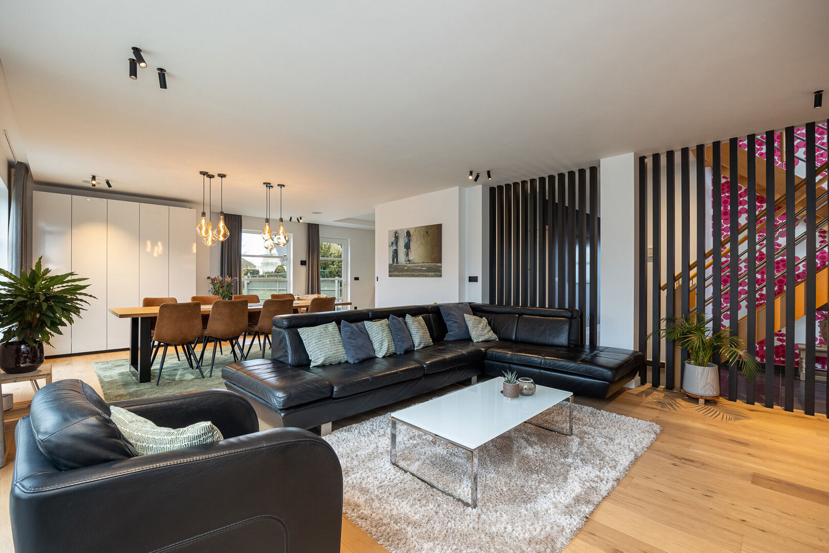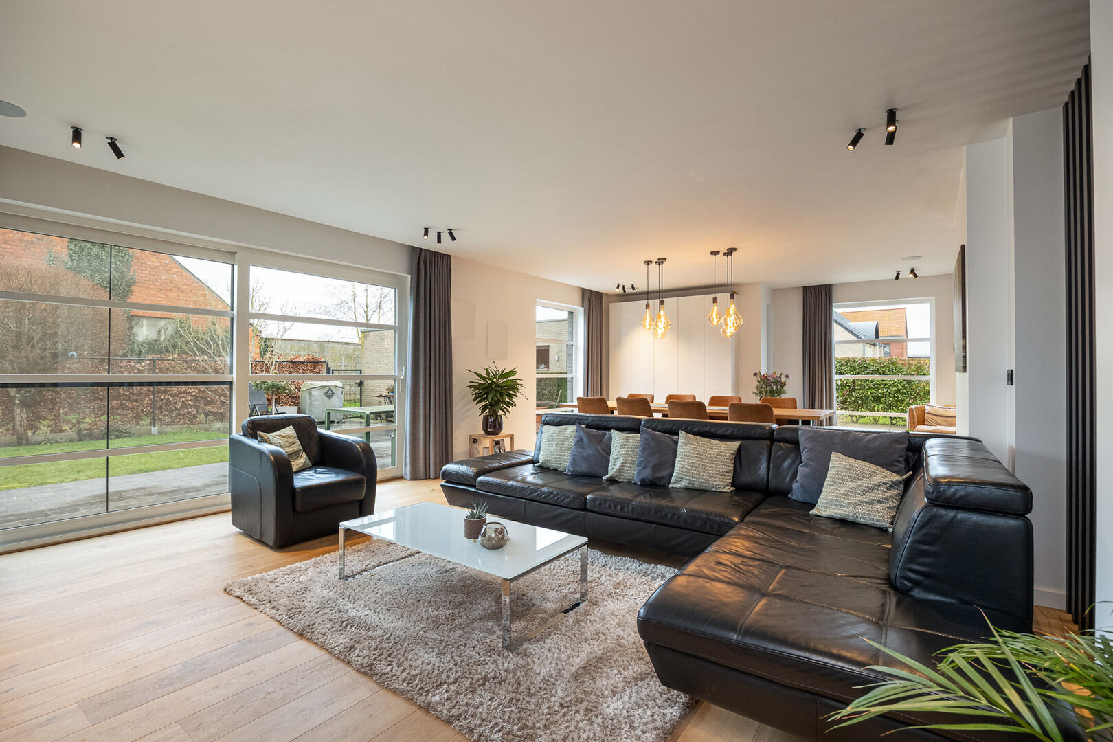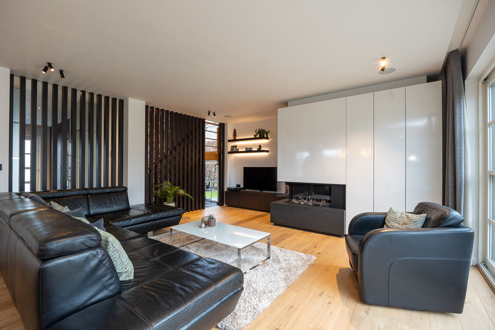De leefruimte beschikt over grote raampartijen en biedt voldoende plaats voor een eet- en zithoek. Daarnaast zorgen de ingebouwde kasten en de gezellige gashaard voor extra comfort en sfeer. Achter de houten wand, deels onder de trap, bevindt zich nog een leuk hoekje, ideaal om vb speelgoed op te bergen.