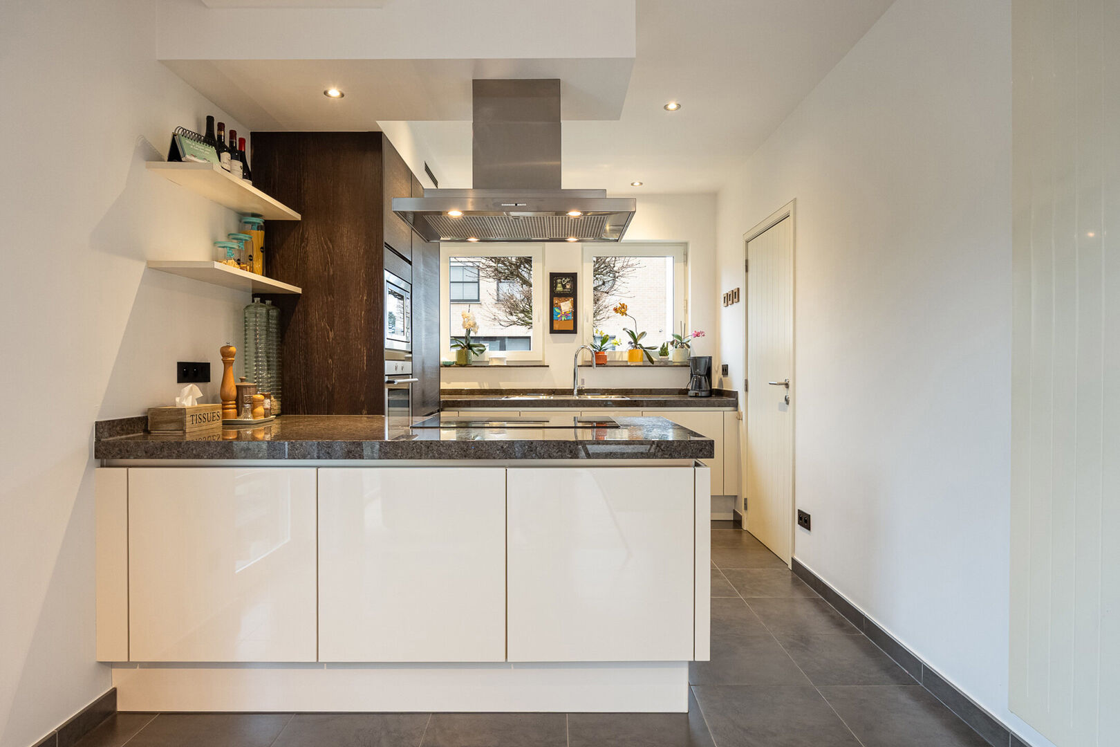Verderdoor komt u in de lichtrijke leefruimte met open keuken. De keuken is uitgerust met een stijlvol keukeneiland in graniet en geniet van veel natuurlijke lichtinval, met een mooi zicht op de leefruimte. Naast de keuken bevindt zich een praktische berging met extra opbergruimte en aansluiting voor wasmachine en droogkast.