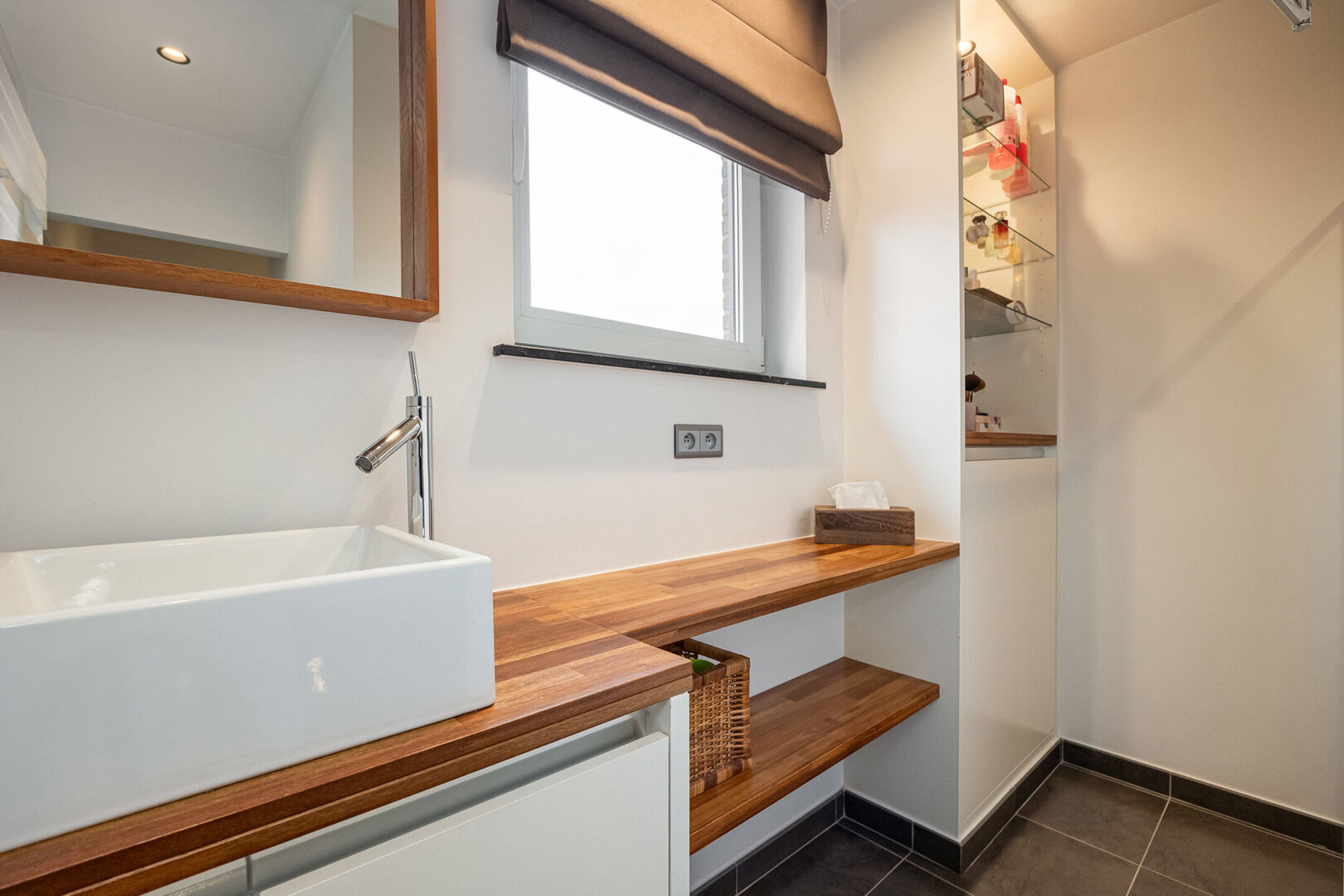 De woning beschikt over twee badkamers. De eerste badkamer is uitgerust met een dubbele lavabo en een inloopdouche. De tweede badkamer beschikt over een enkele lavabo en een regendouche. Het toilet is apart op de gang van de verdieping.