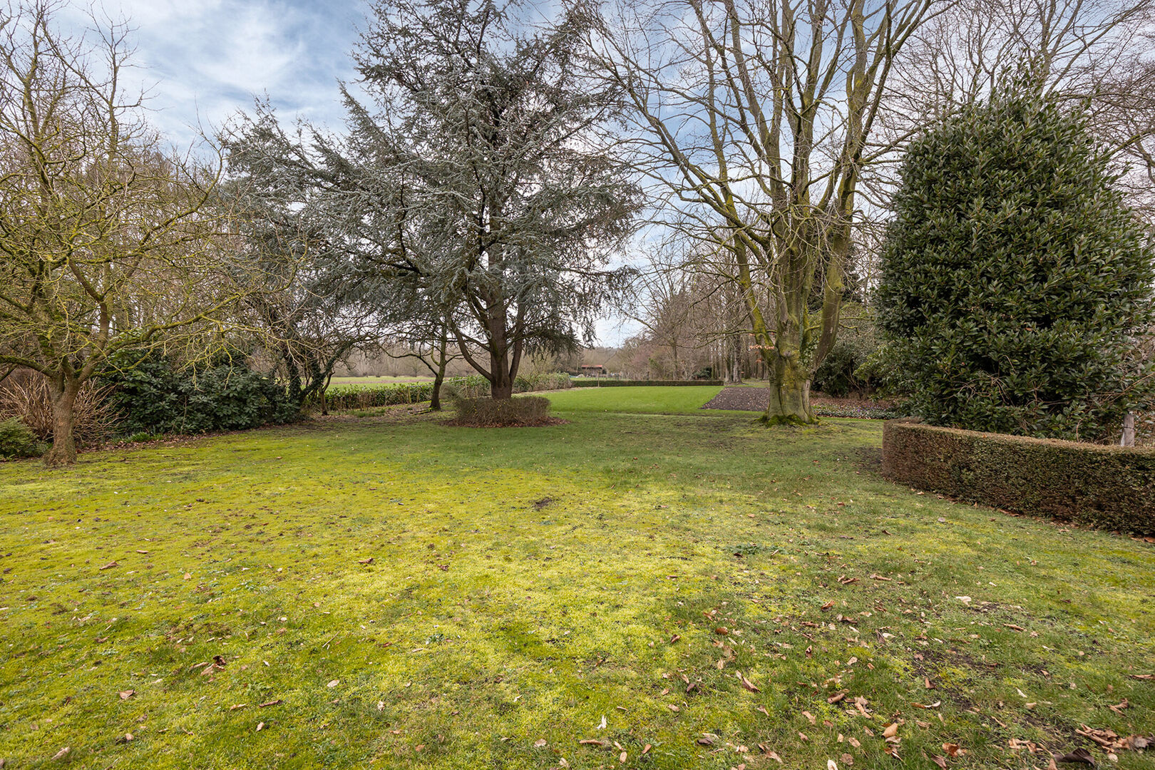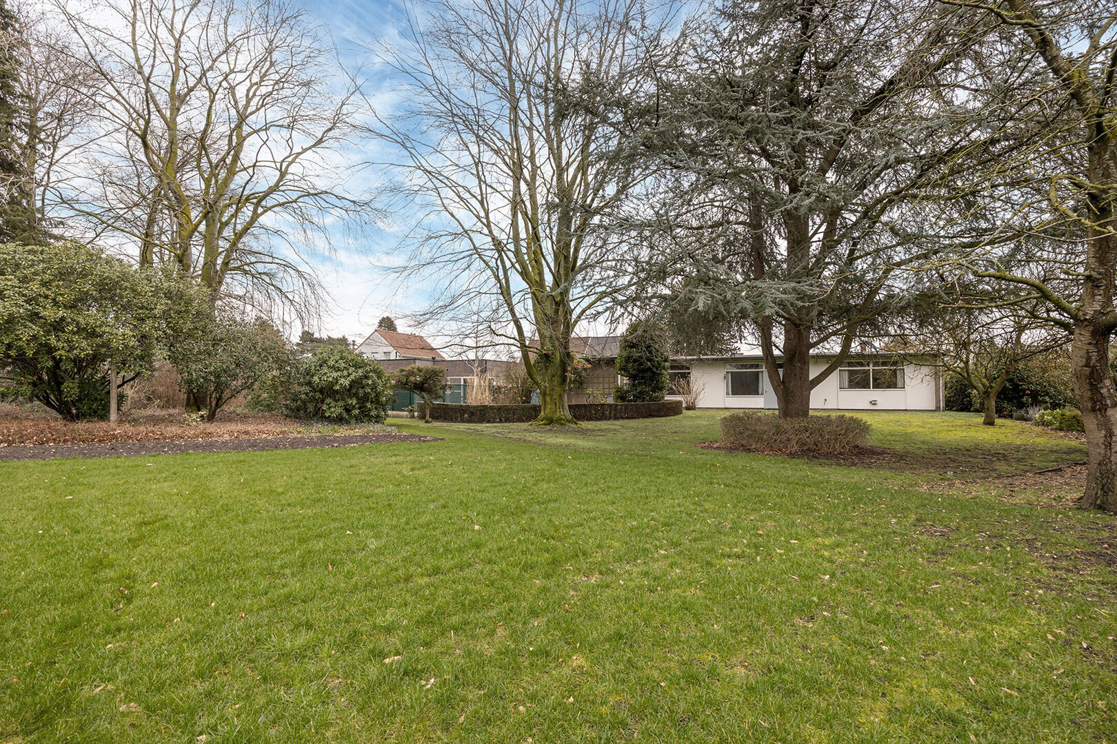Buiten geniet u van een uitgestrekte, zonnige tuin met volwassen bomen, waar rust en privacy centraal staan. De oprit en garage zorgen voor voldoende parkeergelegenheid.