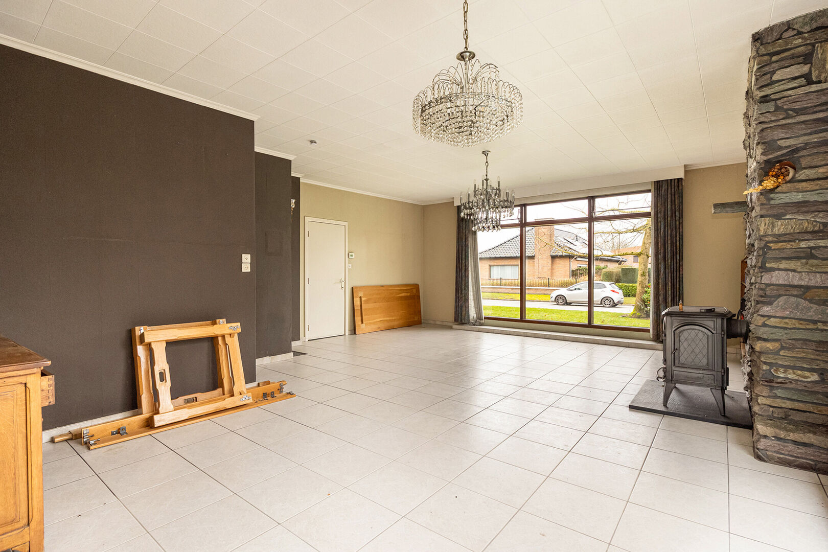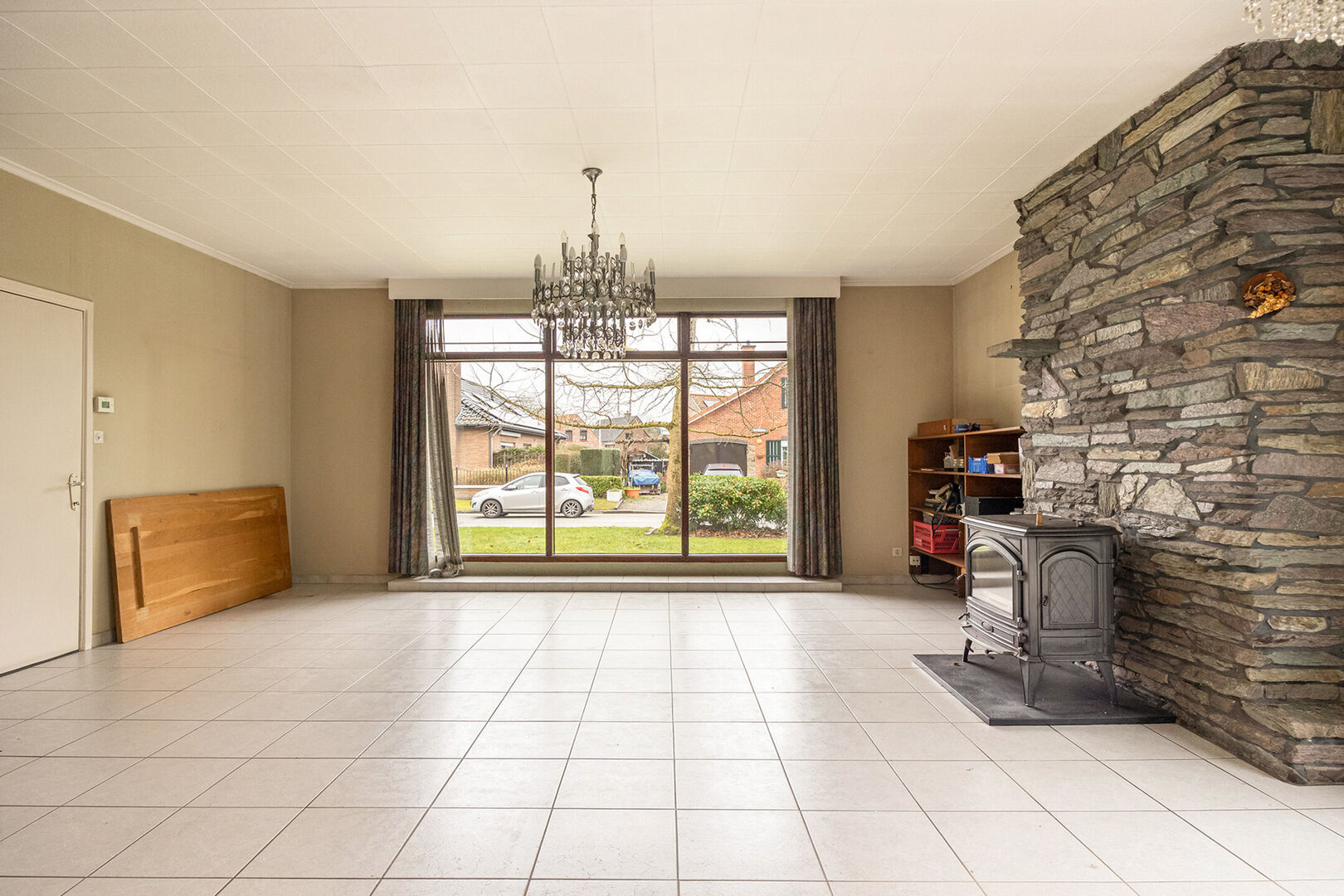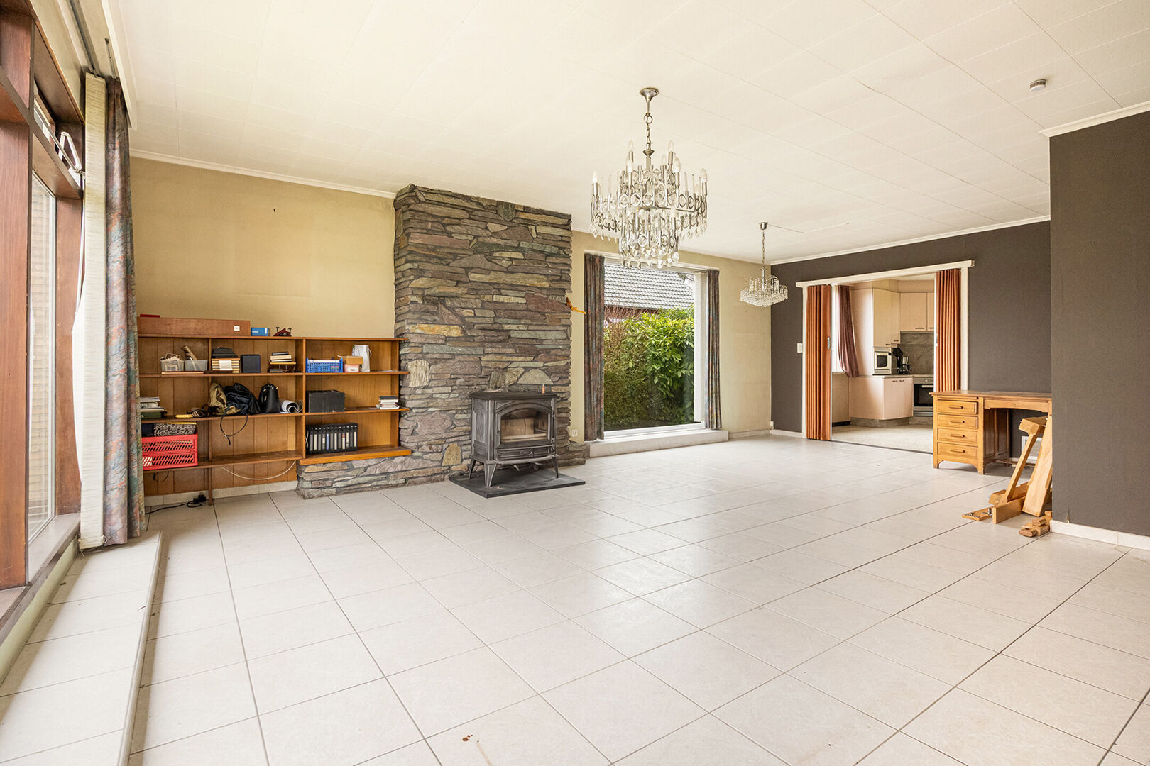 U wordt verwelkomd in een uitnodigende inkomhal die toegang biedt tot de verschillende ruimtes en meteen een aangenaam gevoel creëert. De woning beschikt over een lichtrijke leefruimte met grote raampartijen en een haardkachel, wat zorgt voor een warme en gezellige sfeer. Aansluitend vindt u de keuken met zicht op de tuin, waar u geniet van een mooi groen uitzicht, hetgeen koken en tafelen extra aangenaam maakt.