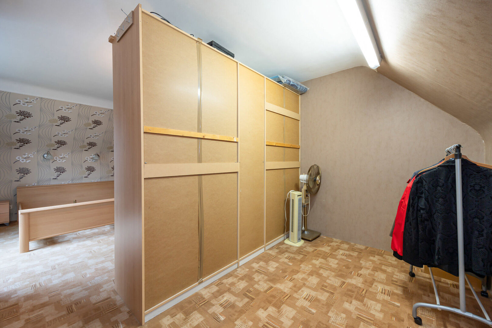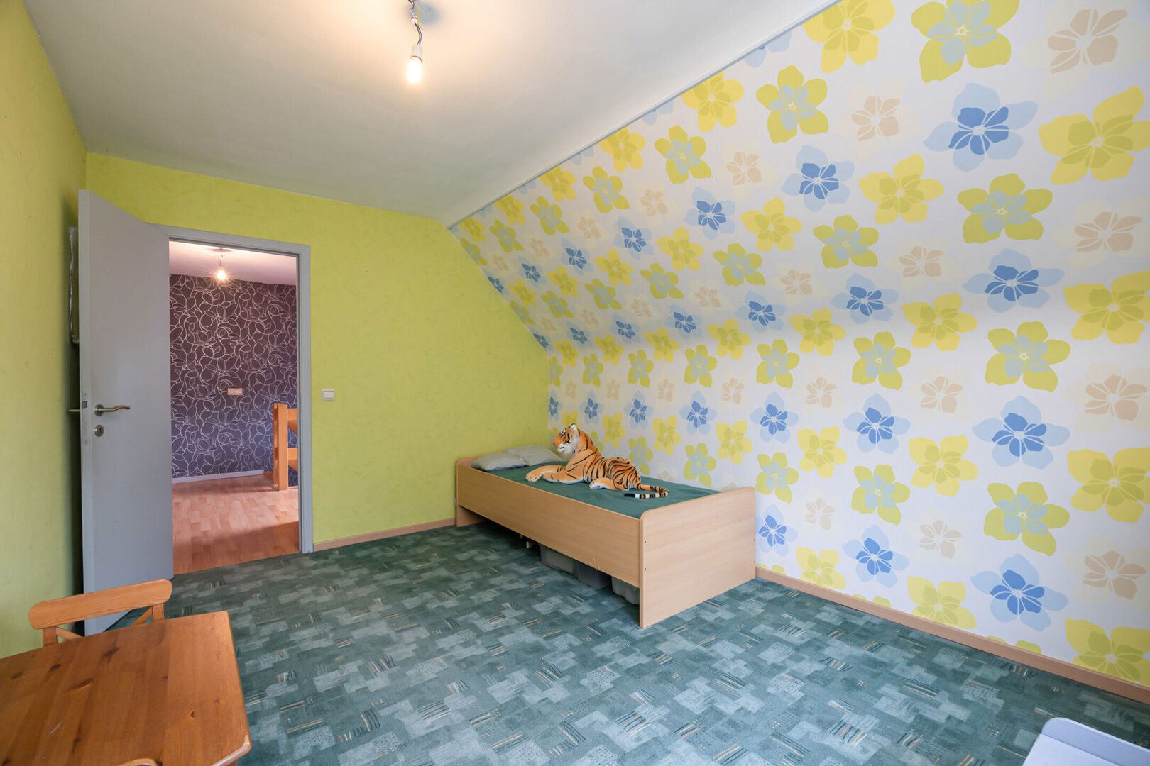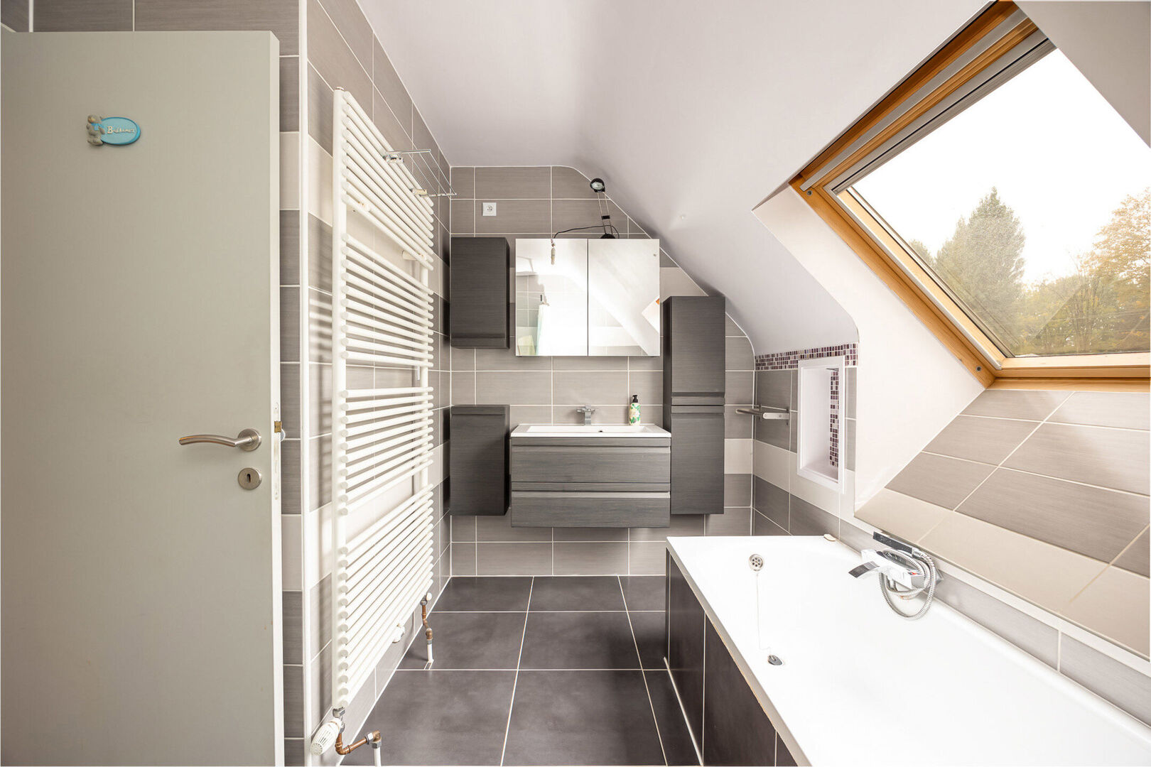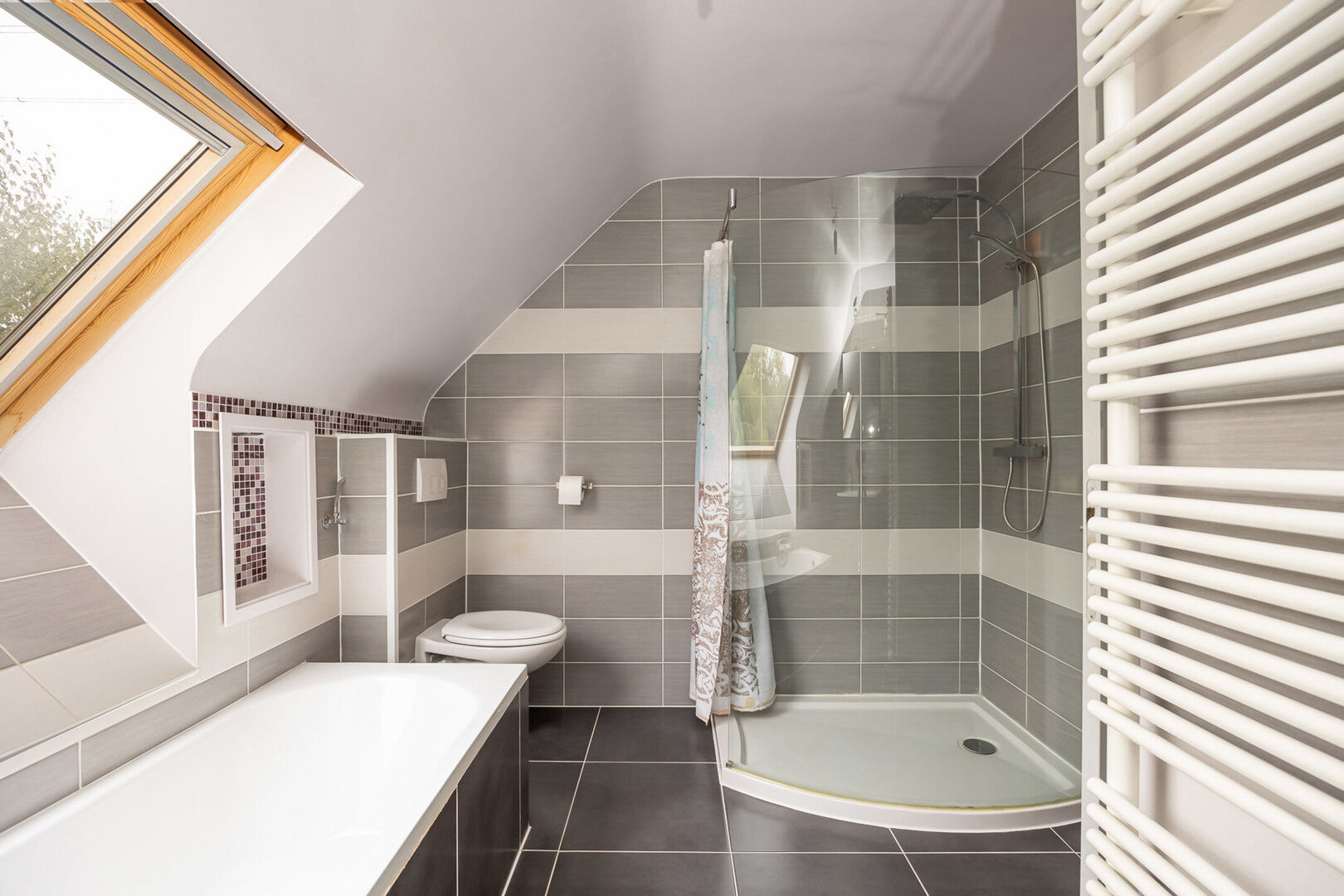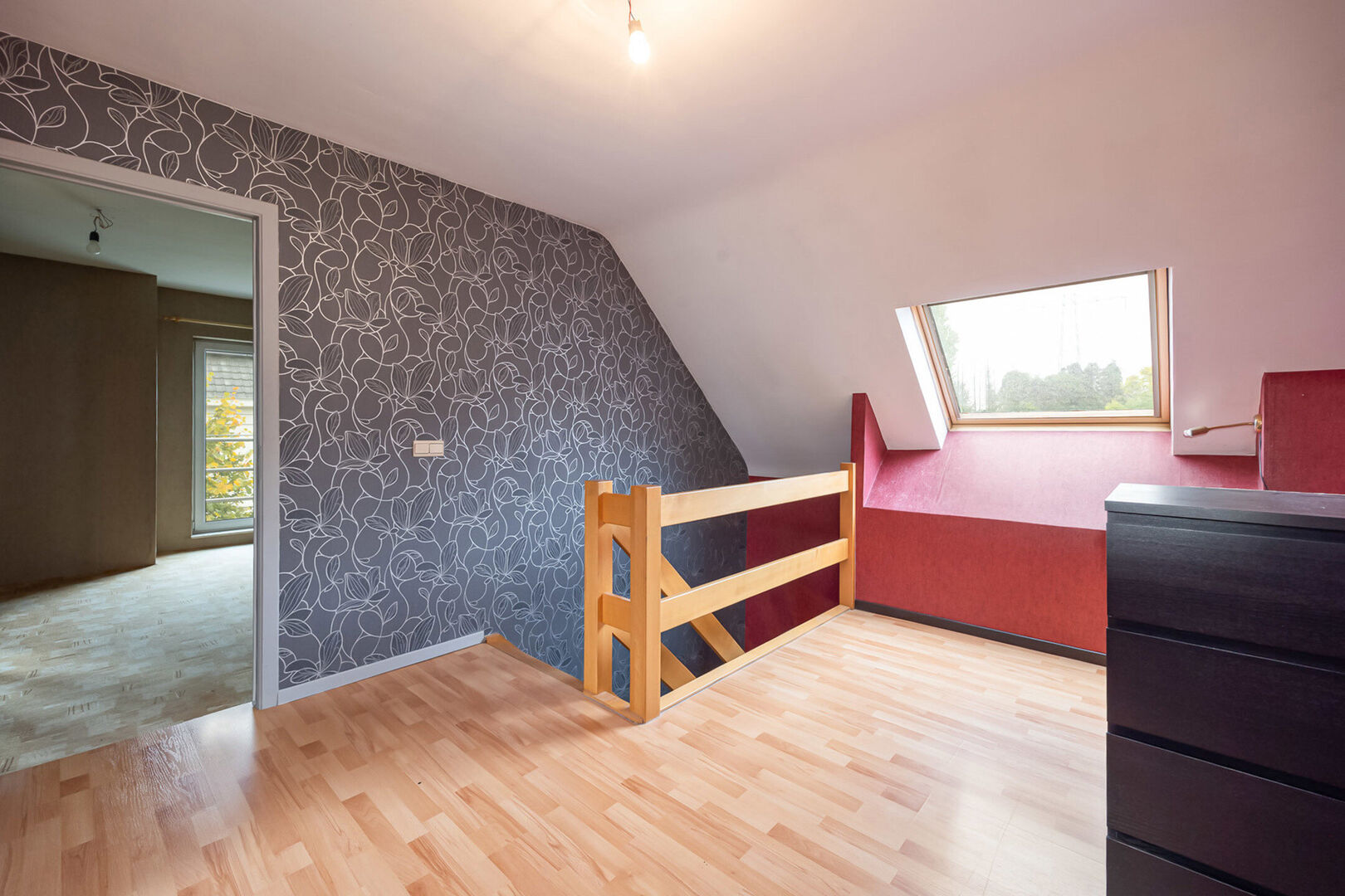 Op de eerste verdieping zijn er drie volwaardige slaapkamers, waarvan één met aansluitende dressing of opbergruimte. De badkamer is voorzien van een inloopdouche, ligbad en tweede toilet. De zolder is bereikbaar via een trapladder en biedt extra bergruimte.