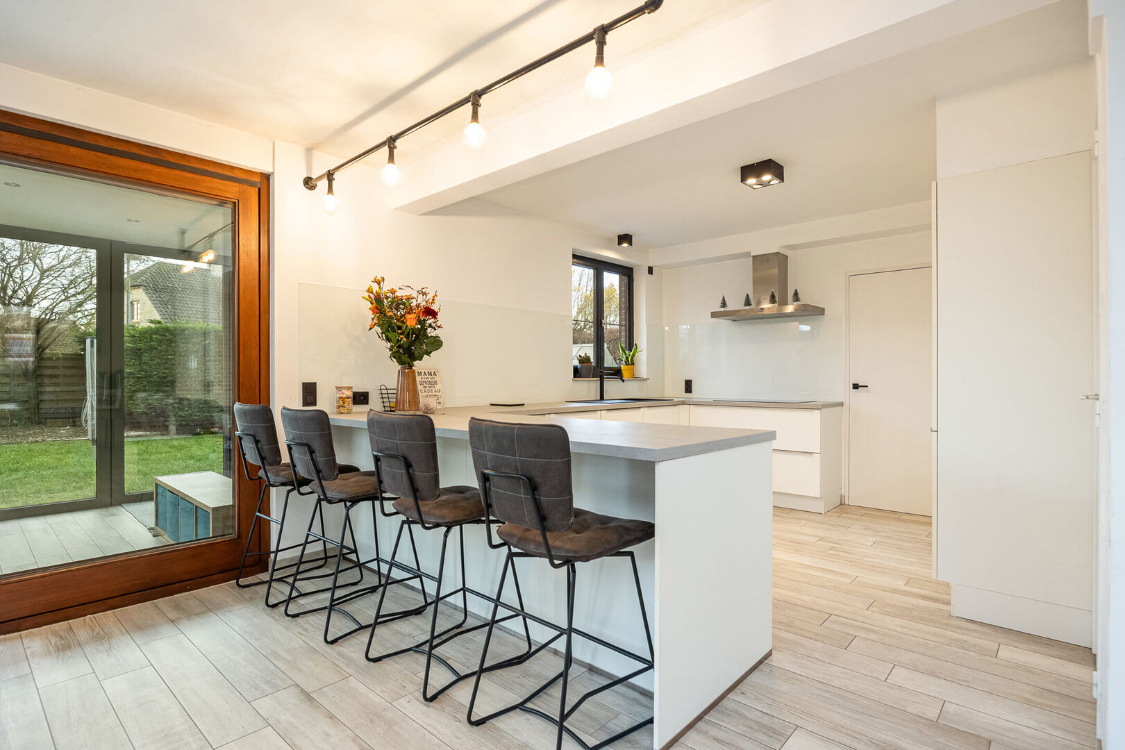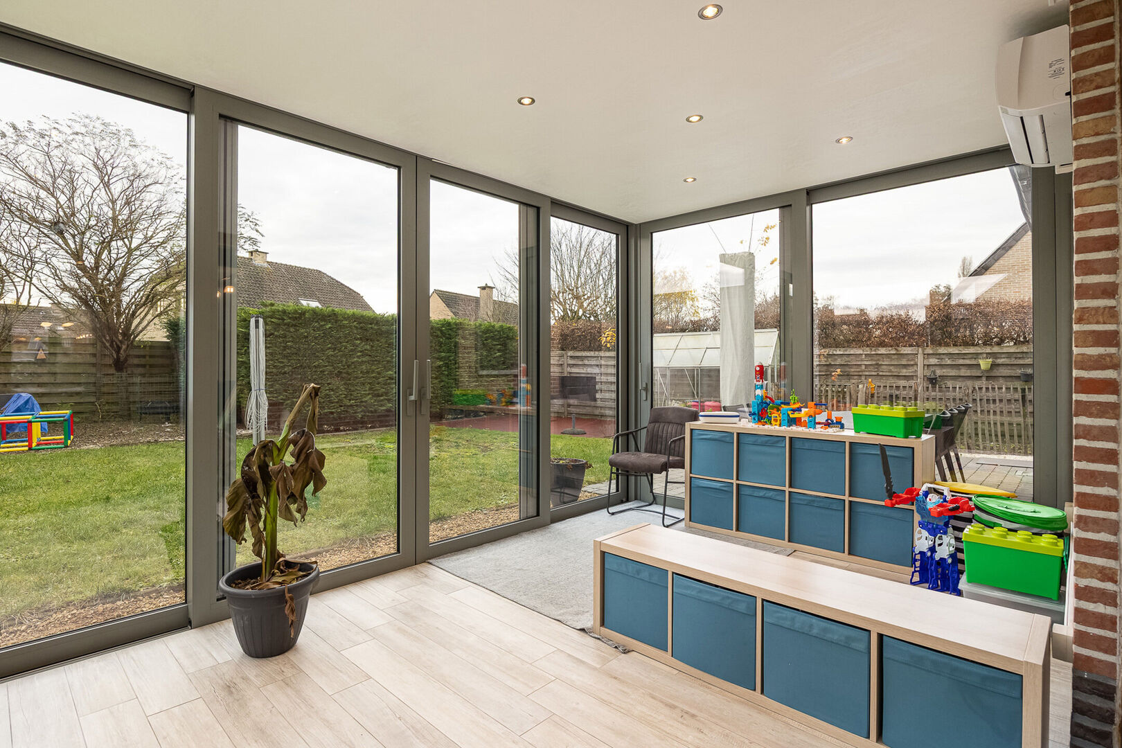 De open keuken is volledig uitgerust en beschikt over een praktisch keukeneiland. Aansluitend vind je de grote leefruimte, met voldoende plaats voor zowel een zithoek als een eetgedeelte. De nieuwe veranda vormt een mooie uitbreiding en kan perfect dienen als speelruimte, tweede zithoek of hobbyruimte.
