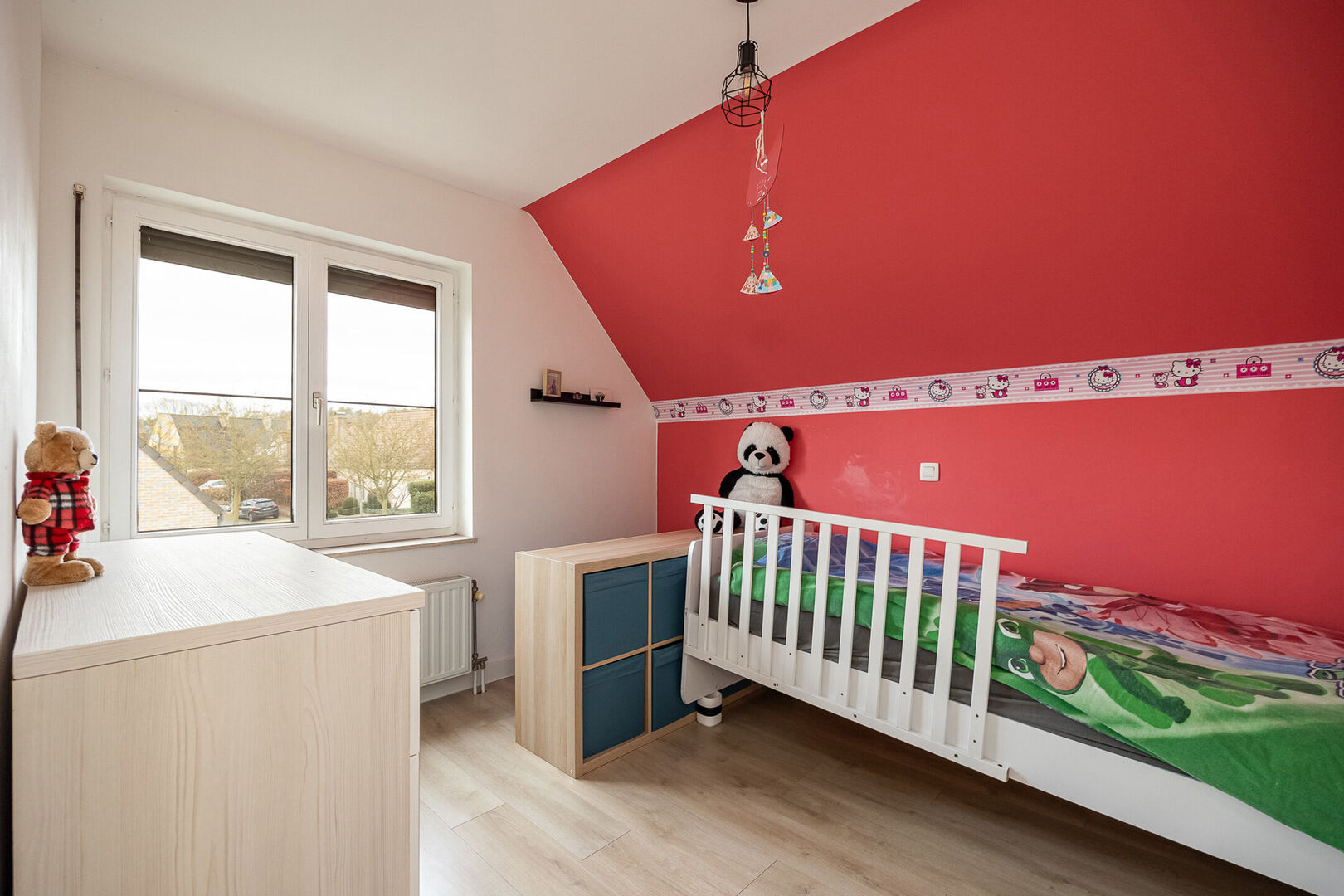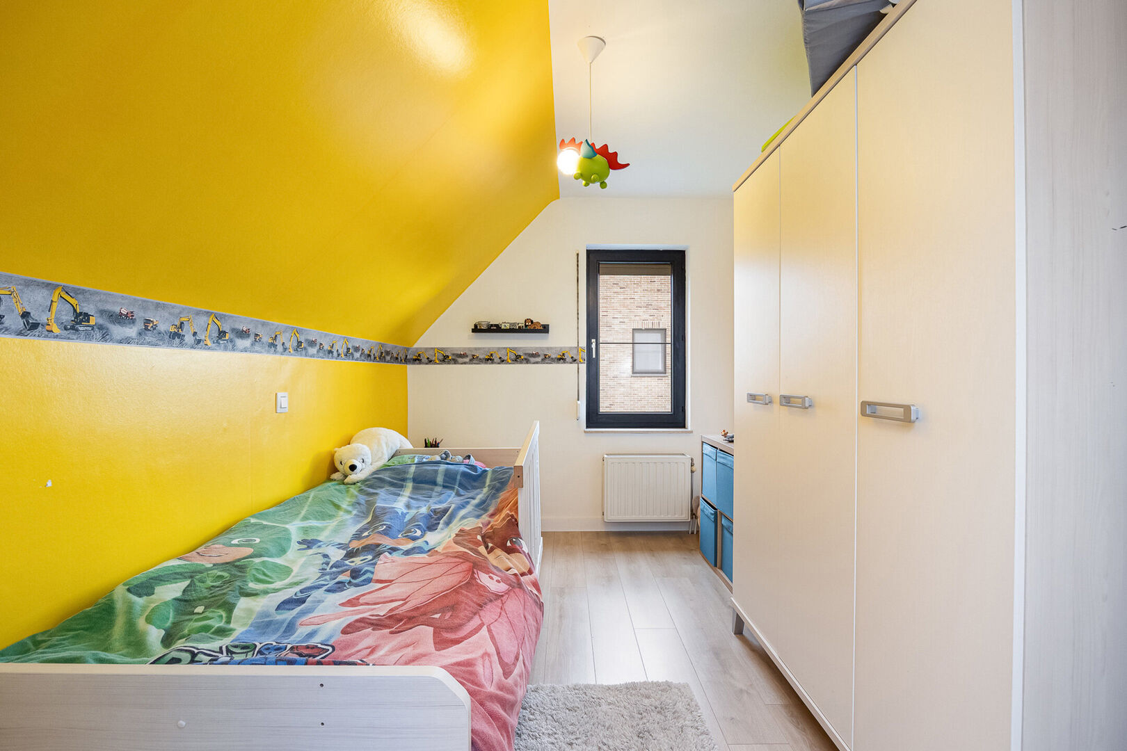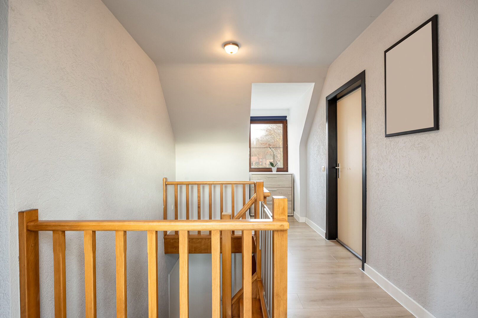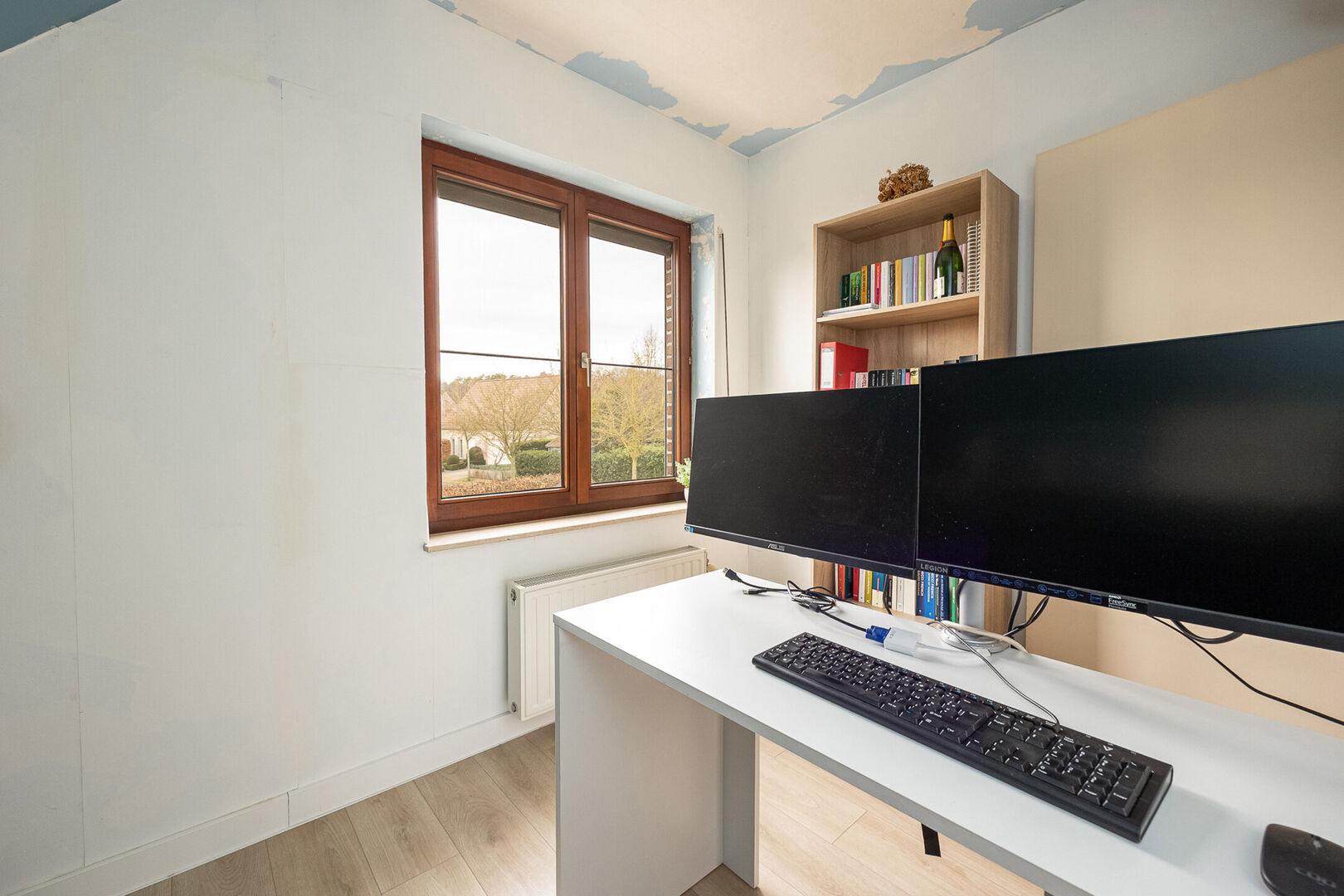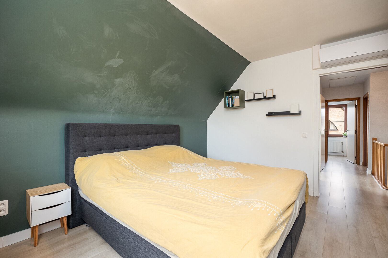 Op de eerste verdieping ontdek je drie volwaardige slaapkamers en een volledig gerenoveerde badkamer met moderne inloopdouche. De 4e kamer is compacter en wordt momenteel gebruikt als thuisbureel.