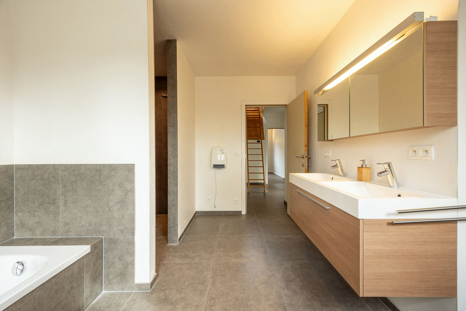 Op de verdieping treffen we drie zeer ruime slaapkamers waarvan één beschikt over extra bergruimte. De badkamer is ingericht met inloopdouche, ligbad en dubbele lavabo.