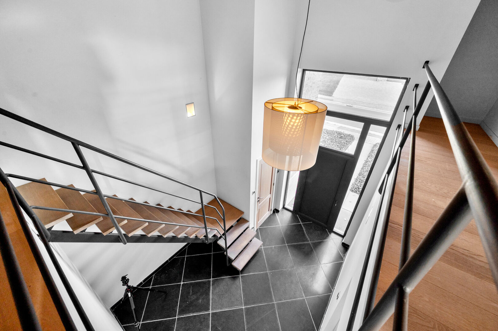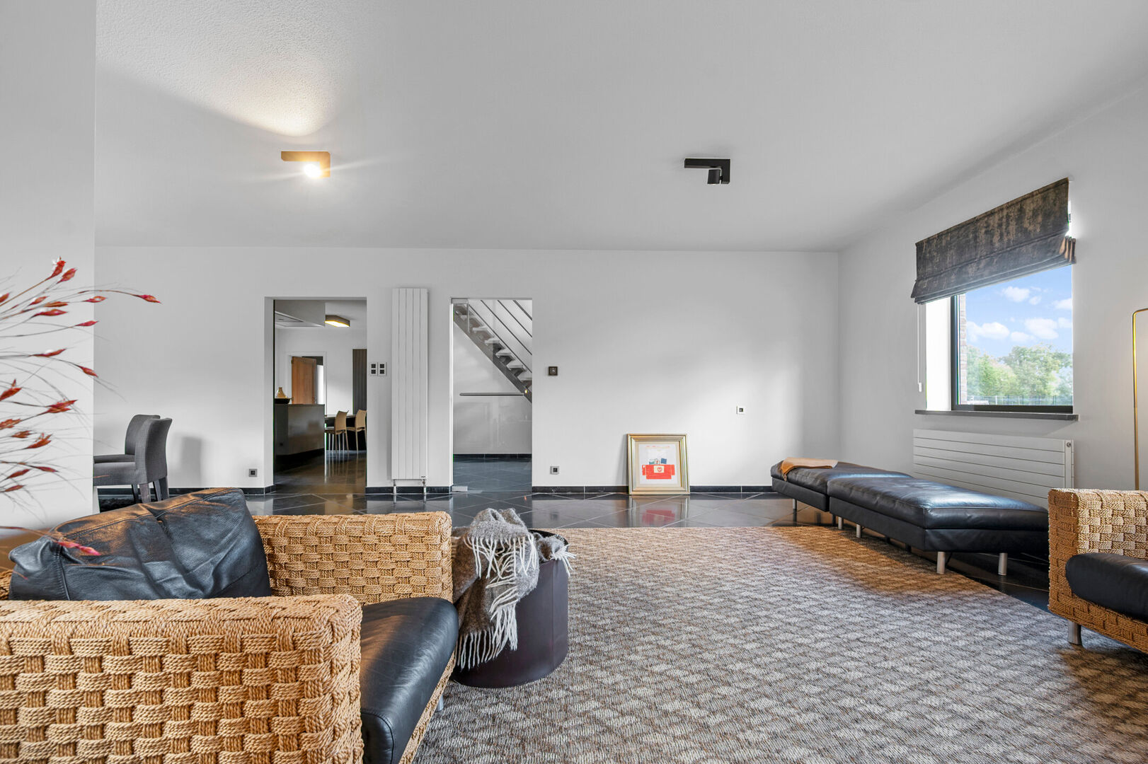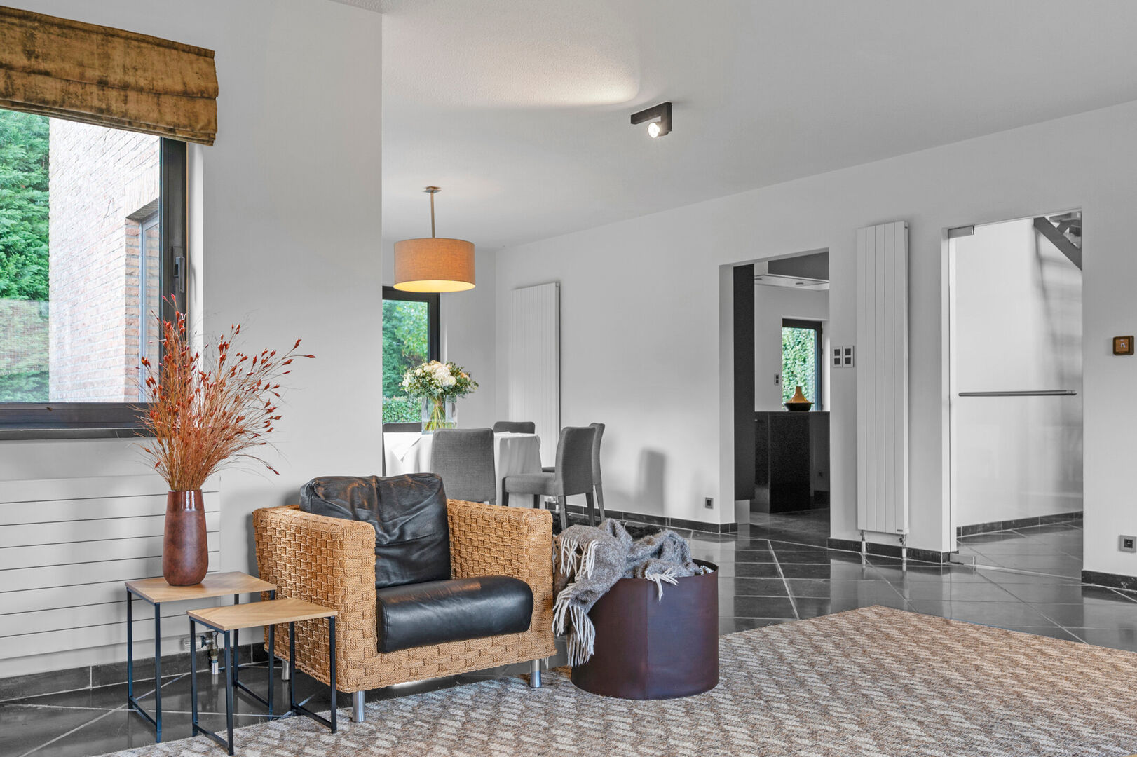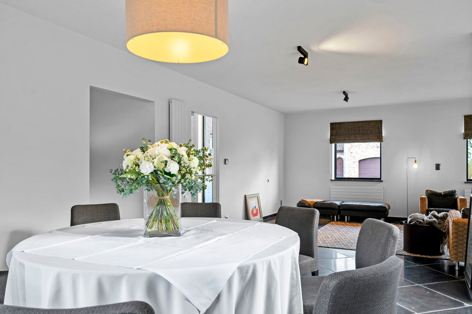 Bij binnenkomst via de centrale inkomhal - met gastentoilet - word je meteen ondergedompeld in licht en grandeur. De leefruimtes zijn ruim en open, met uitzicht rondom – aan de voorzijde op de velden, achteraan op de verzorgde tuin.