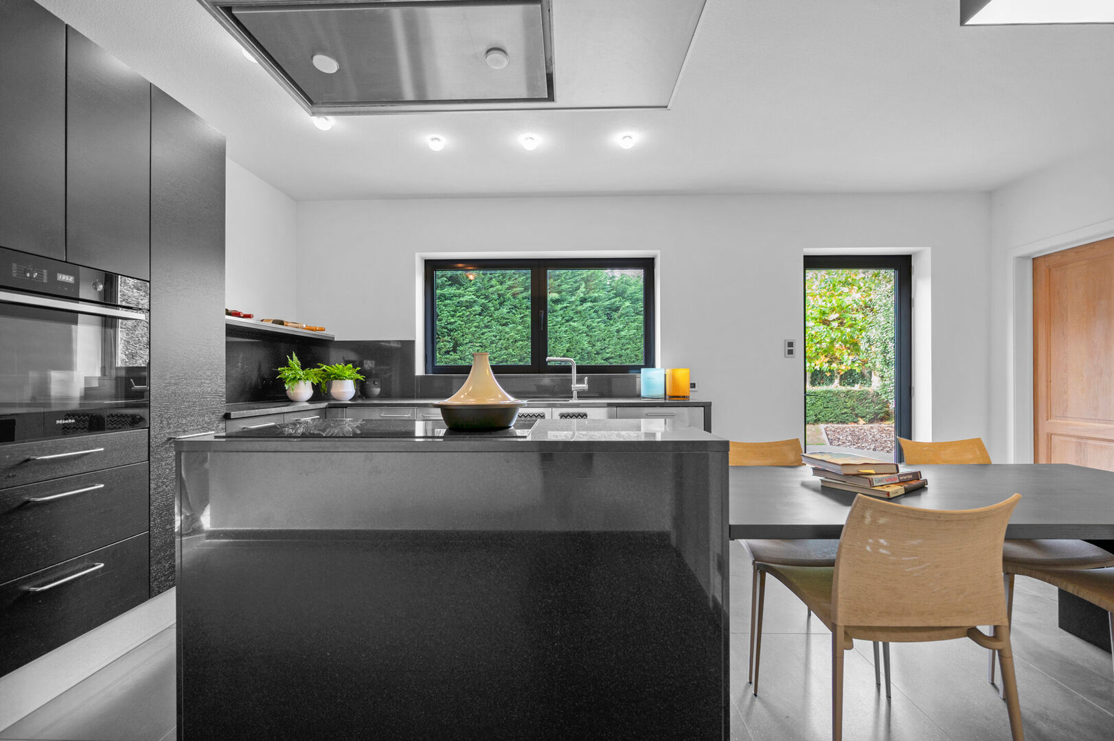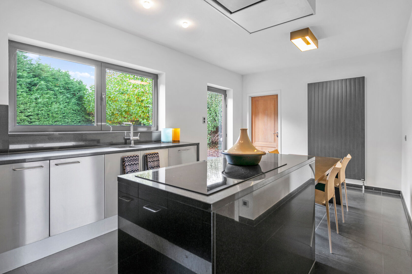 Vanuit de keuken kan men naar de gezellige tuin met aangename terrassen. Op heden biedt de tuin door de enorm hoge beplanting absolute privacy maar wie wil kan een deel van de haag weghalen en genieten van het zicht op de achterliggende velden.