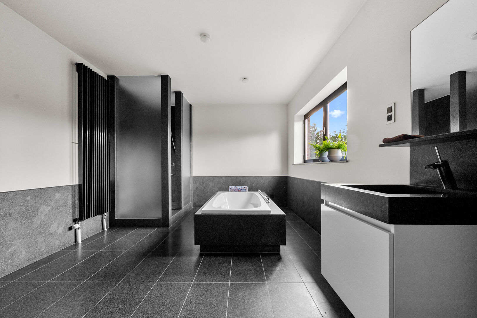Op de eerste verdieping bevinden zich drie royale slaapkamers. De masterbedroom beschikt tevens over een dressing. De badkamer, fraai in natuursteen, biedt zowel een instapdouche als een vrijstaand bad voor een ultiem wellnessgevoel.