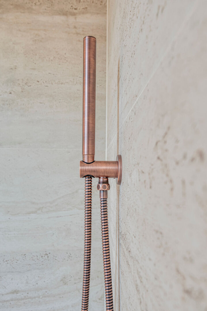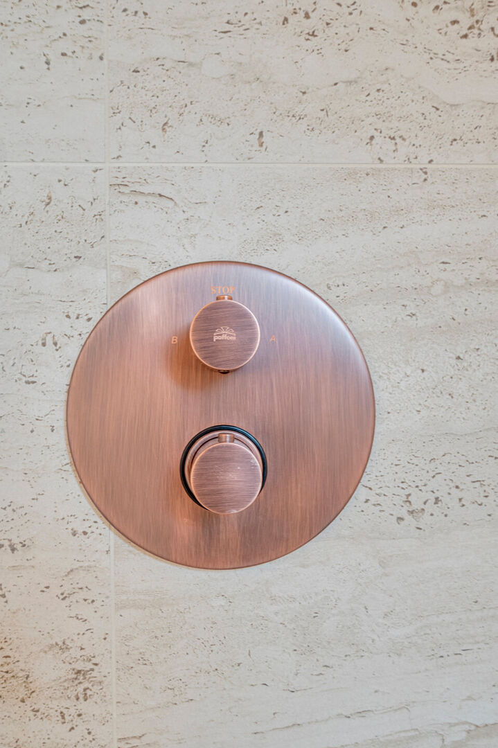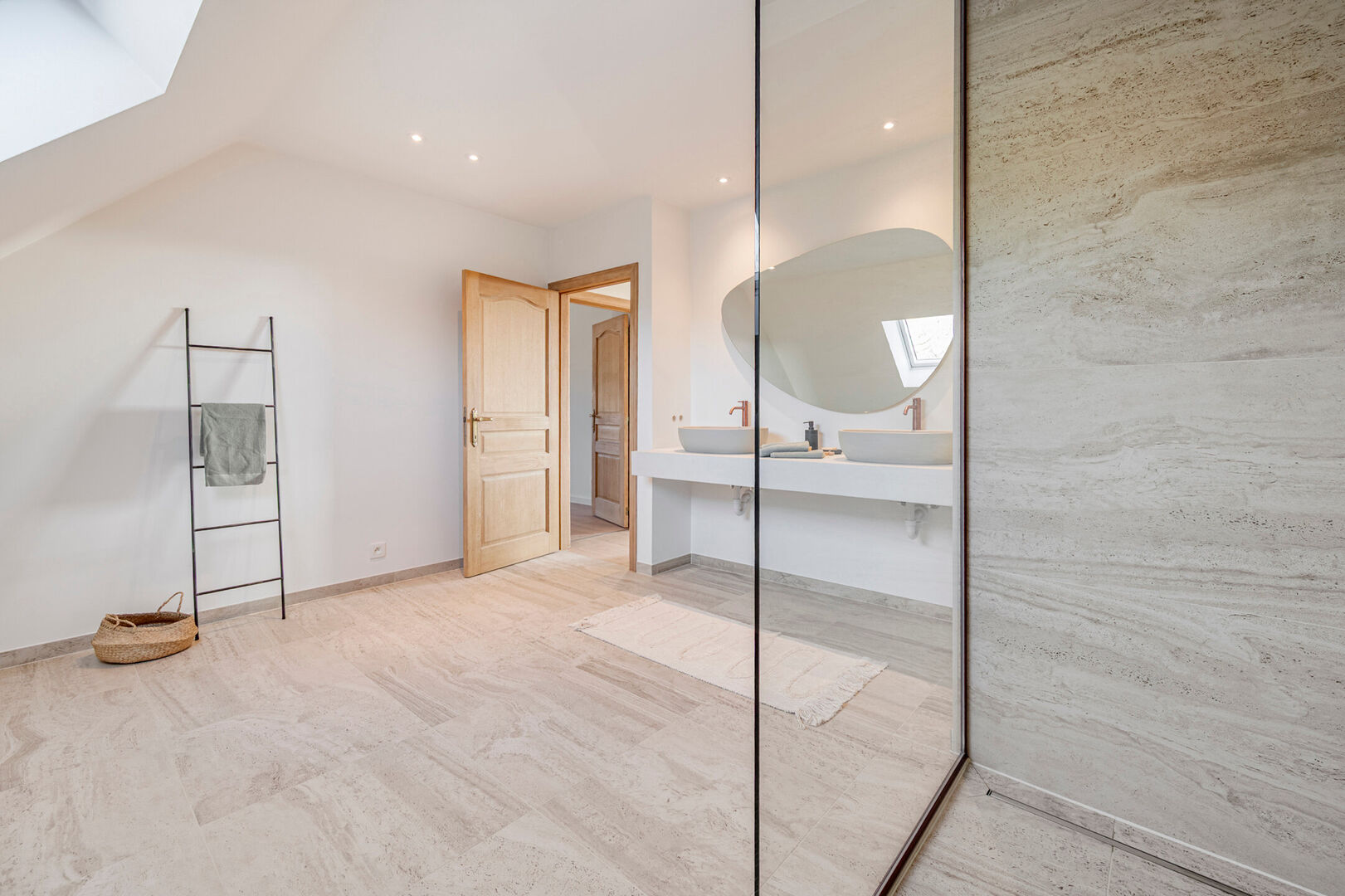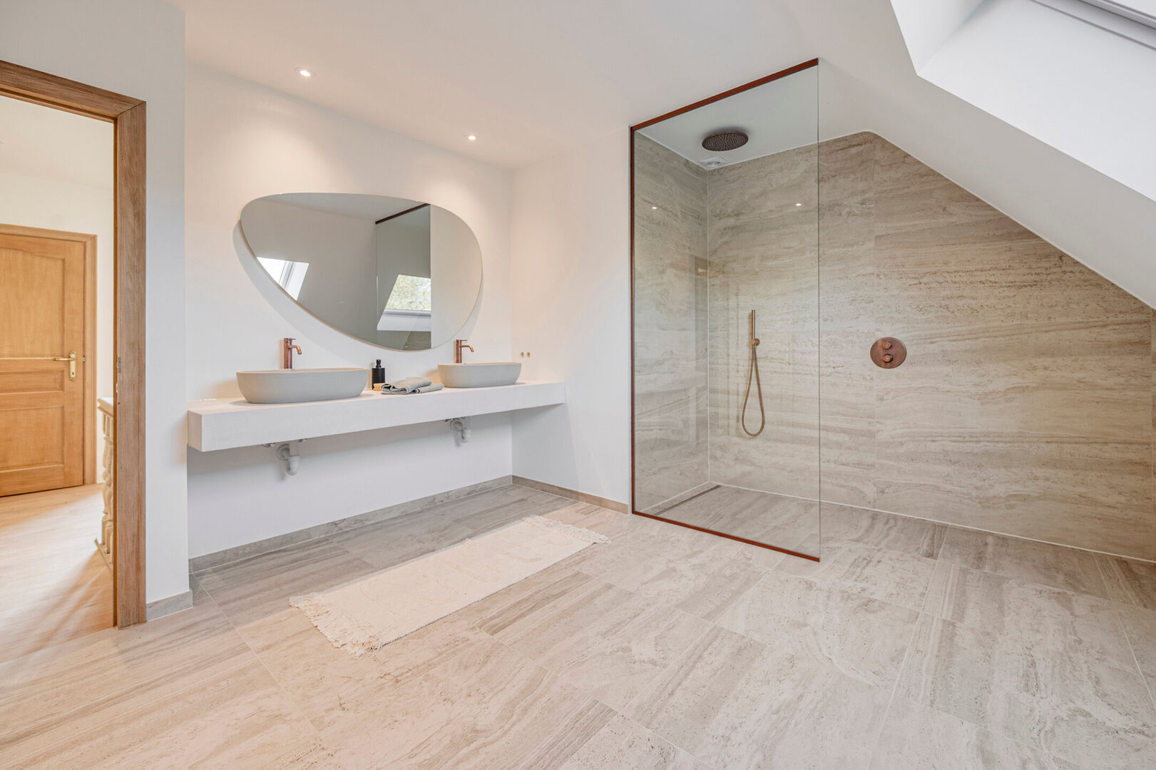 De badkamer is een streling voor het oog met dubbele lavabo, design spiegels, ROND stopcontacten en een grote inloopdouche.